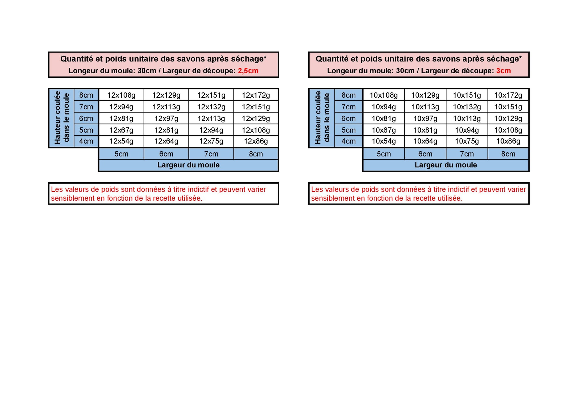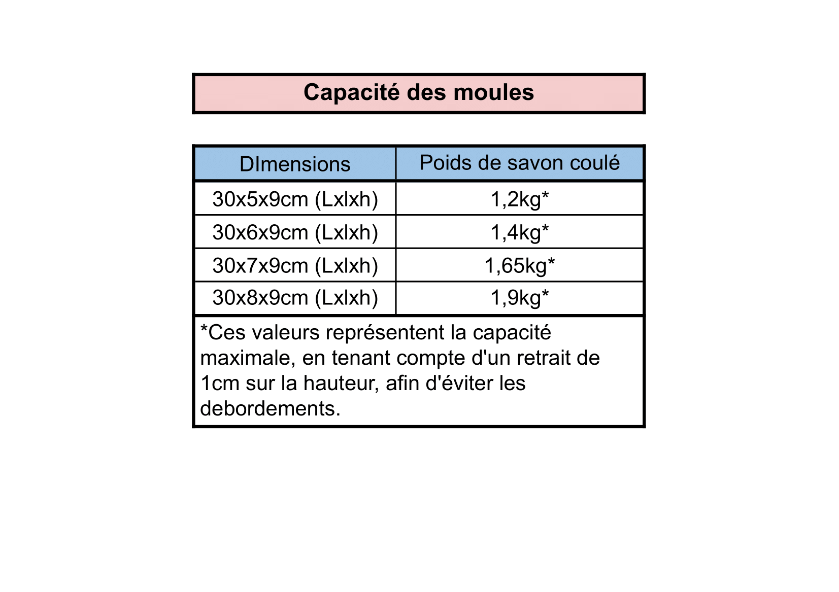 ► Permet de réaliser 12 savons de 2,5cm ou 10 savons de 3cm d'épaisseur.